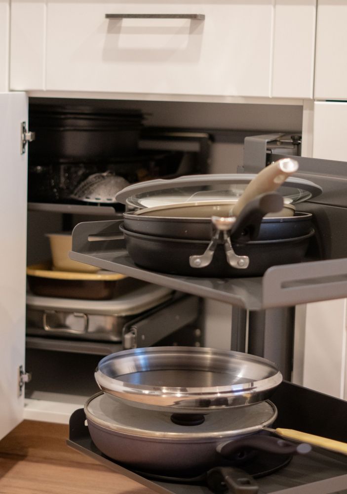 Es war überraschend, wieviele Ideen bei der Planung durch Wolfgang gekommen sind, an die ich überhaupt nicht gedacht hab. Zum Beispiel der Glaskasten, um die Erinnerungsstücke von unseren Reisen aufzustellen. Oder die Lösung mit der ausfahrbaren Schublade im Eck, in dem der ganze Platz ausgenutzt wird und ich jetzt wunderbar meine ganzen Pfannen unterbringen kann. Die Kreativität hat mich gefreut, mit der er meine Vorstellungen, die ich zu dem Zeitpunkt gar nicht ausdrücken konnte, umgesetzt hat. Wolfgang hat trotzdem alles richtig verstanden. Jetzt gibt es eine abgehängte Decke und genügend Licht in der Küche!